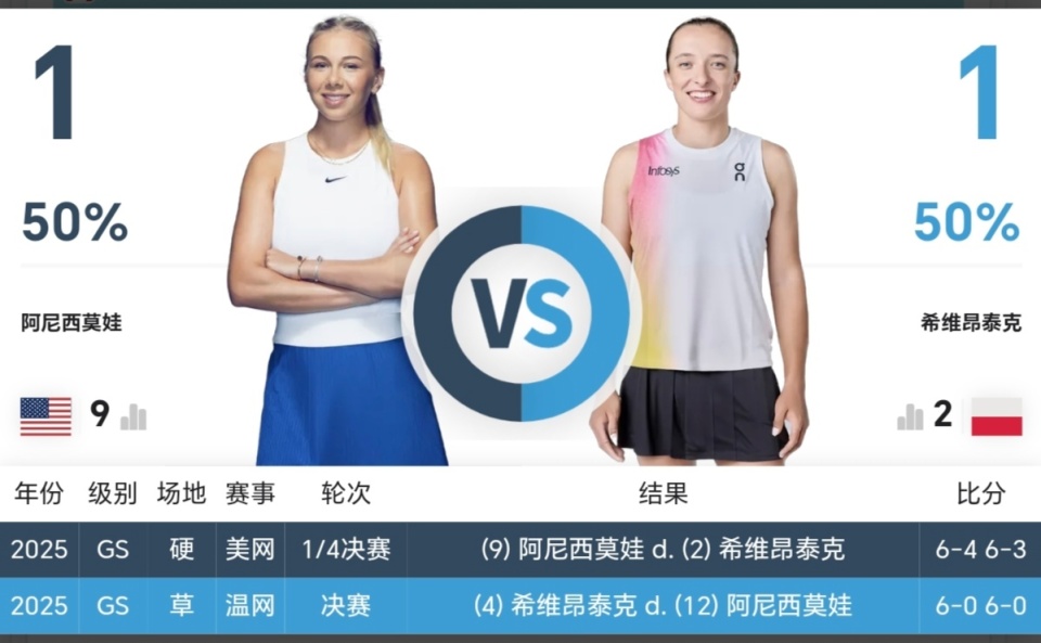 作为复仇之战,本场比赛备受期待。阿尼西莫娃在美网前四轮仅失一盘,上一轮更以送蛋方式淘汰巴西名将玛雅,状态同样火热。斯瓦泰克则延续强势表现,在八分之一决赛中轻松战胜实力不俗的亚历山德罗娃。